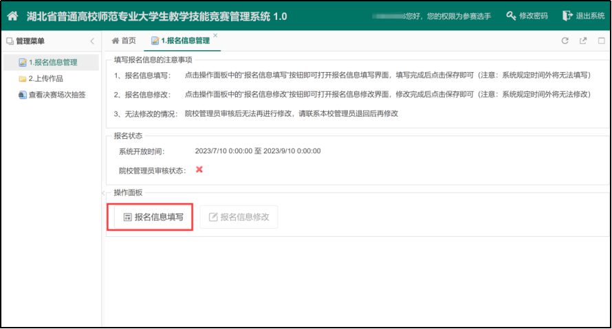 报名信息填写后,如需修改,请点击左侧菜单中的“1、报名信息管理”,打开页面后可以在页面中点击“报名信息修改”按钮即可打开报名信息修改界面(如图2-3所示)。注意:在院校管理员审核之前,选手可以对本人的报名信息进行修改。