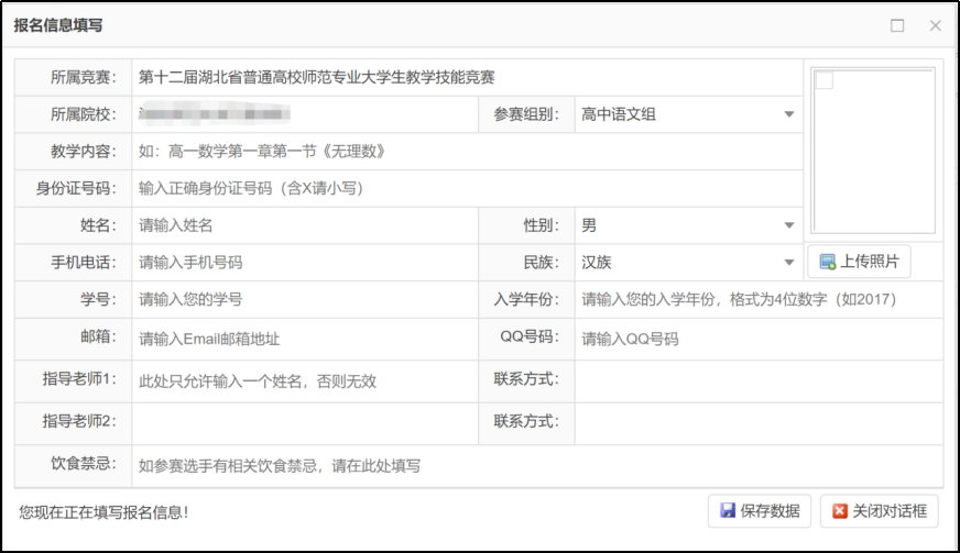 点击左侧菜单中的“1、报名信息管理”,即可打开报名信息管理页面,如图2-1所示。点击页面中的“报名信息填写”,即可弹出报名信息填写页面,如图2-2所示,在页面中根据提示输入报名信息,注意:所属竞赛和所属院校不可修改。其余字段请根据提示进行输入注册,完成后点击“保存数据”即可保存。