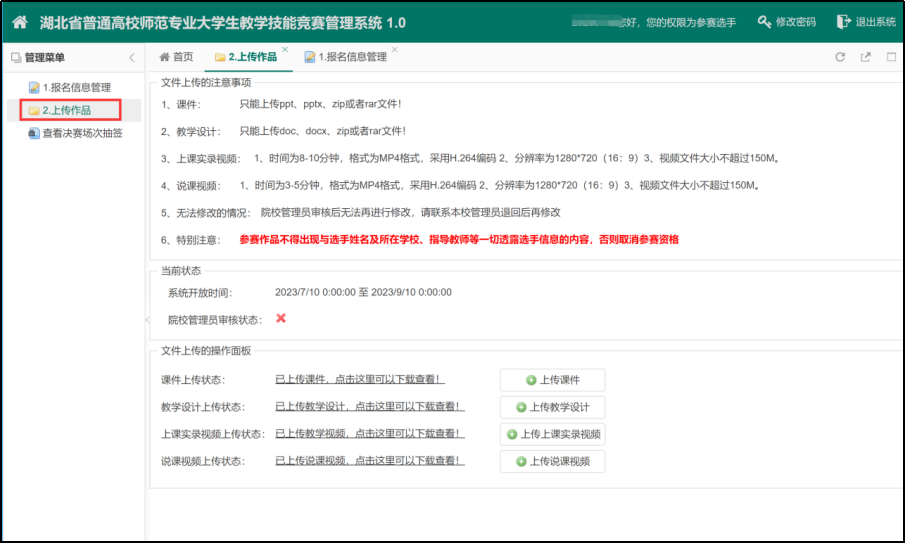 注意:在院校管理员未审核本校选手的材料前,选手可以对上传的作品进行修改。